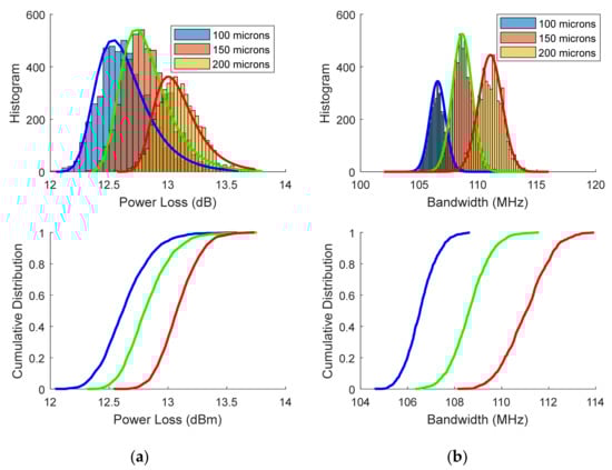 For this reason, and since the drastic increase in power loss with the number of connectors is related to the relatively large air-gap of 150 µm, the authors have analysed the effect of changing the longitudinal fibre-to-fibre offset over power loss and bandwidth in order to assess the impact of the air-gap in transmission properties. The simulated link has a total length of 42 m with six 7-m fibre segments joined by 5 connectors. Now, in addition to the typical 150 µm longitudinal offset, we considered another two values for the air-gaps: 200 and 100 µm. These three values are introduced as the means of the Gaussians distributions with standard deviations of 31 µm. Longitudinal fibre offsets are drawn from these three distributions to obtain the separate statistical distributions of power loss and bandwidth for the three different values of air-gap. The other conditions, including lateral x and y misalignments, are the same used in our previous study and are described above.