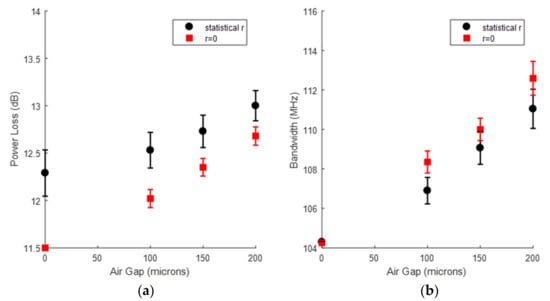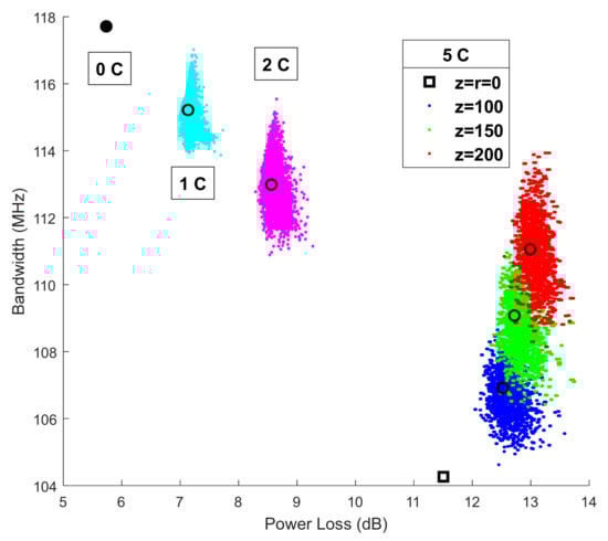Mateo et al. propose in [] an upgrade of the connector matrix model that incorporates lateral and longitudinal misalignment losses based on the calculation of the radiated angular intensity distribution using the Hankel transform. This feature allows modelling air-gap connectors and statistically variable positional shifts to obtain realistic simulation results of the performance of POF avionics links. In a recent work, the impact of this variability in transmission properties has been assessed using the propagation matrix framework combined with the upgraded ST connector model to simplify and speed up the Monte Carlo simulations []. The longitudinal offset (z) is drawn from a Gaussian distribution with a mean of 150 μm (a value typical for an air-gap connector) and a standard deviation of 31 μm. Lateral misalignments (x and y) have also Gaussian distributions with the same standard deviation, but a zero mean, which lead to a Rayleigh-distributed radial offset. These values are chosen to comply with the tolerances defined in the IEC-60793-2-40 specifications, A4a.2 fibre class.
