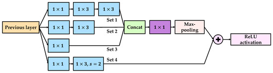 The structure of the proposed feature-extraction module is shown in Figure 5. The module is divided into two parts: (1) feature-extraction and (2) residual connection. In Figure 5, from top to bottom, the first three sets of convolutional layers are the feature-extraction parts. Set 1 consists of a filter, a filter, and a filter. Set 2 consists of a filter and a filter, and Set 3 consists of a filter. Moreover, Set 4 at the bottom is the residual connection part, consisting of one filter and one filter with a step length of 2. The multiple convolution filters enabled the model to learn multiscale features from the signal. Subsequently, the three feature vector sets were concatenated and connected through linear activation and max-pooling layers. To implement a residual connection, the output dimensionality of Set 4 was set to be the same as that of the max-pooling layer. Hence, the stride of the filter in Set 4 was equal to 2. Finally, the output of the module was the sum of the extraction and residual parts with the ReLU activation function. When designing the feature-extraction module, the following concepts were satisfied: the convolution filter should first be used to scale down the dimensionality before applying different kernels. The number of convolutional kernels should be larger in a more complex feature-extraction set. In Figure 5, Set 1, which had two convolutional layers, had more kernels than the other sets. Furthermore, Set 3 only consisted of a convolutional layer with the smallest kernel numbers. Furthermore, in Figure 5, only the filter with the purple background outputs with a linear activation function, and the other filters in the module output with the ReLU activation function.