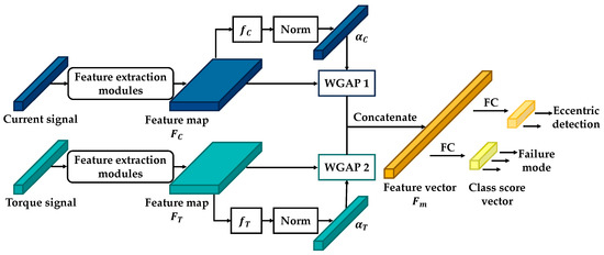 Furthermore, some researchers have demonstrated that the GAP layer can be effectively utilized in 2D object localization [40,41]. In this study, weighted global average pooling (WGAP) was adopted to determine the frequency components that contributed to the signal-level classification. The network architecture of the proposed model is illustrated in Figure 7. The network is a two-input, two-output model. The two inputs are the frequency-domain signals of the current and torque. The features of the two input signals were extracted individually using several feature-extraction modules. Subsequently, the two WGAP layers were individually used to obtain the most representative features from the feature maps and . Then, the two feature vectors, WGAP1 and WGAP2, were combined to obtain the fusion feature vector . Finally, was used to classify the failure mode and eccentric effect.