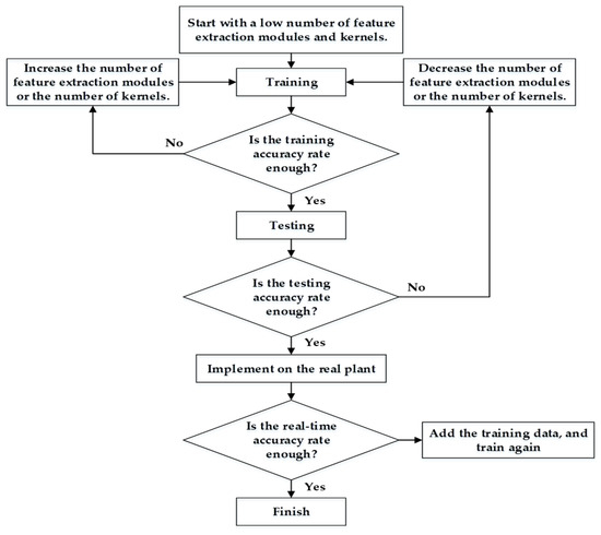 To confirm that the proposed 1D CNN model could be implemented on a real platform, a simple design flowchart was designed and is presented in Figure 8. The principles used to adjust the parameters are described in Section 3.2. For the feature-extraction module, the kernel number of Set 3 must exceed that of Set 2, and the kernel number of Set 3 must be the least.