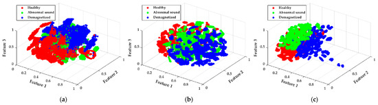To provide an intuitive understanding of the effectiveness of the proposed method, the feature vectors learned from CNNT, CNNC, and the proposed model were visualized using the t-SNE algorithm. The t-SNE algorithm is a technique for dimensionality reduction. The 248-dimensional feature vector was reduced to three, and the visualization results are shown in Figure 9. By rotating and observing the plot, the features can roughly separate the three classes of failure modes. However, Figure 9a shows that the features of the three failure modes were easily clustered at the boundaries between each class. The separation of the three failure modes is better in Figure 9b than in Figure 9a; however, the features of the healthy, bearing fault, and demagnetized motor are sparsely separated into several groups. In Figure 9c, most features are distributed on the left side of the plot. However, it can be observed that the clustering of features at the boundary was not critical, as shown in Figure 9a. Furthermore, similar to Figure 9b, the features of the three failure modes were separated into several groups, but each group was closer than that shown in Figure 9b. The results shown in Table 5 and Figure 8 confirm the effectiveness of the proposed feature-extraction module and 1D CNN on multisensory fusion.