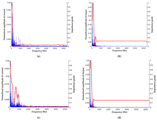 Important grade of the frequency component conducted under the 1000 rpm, 0.24 Nm, and no eccentric effect operating conditions: (a) current signal of the motor with bearing fault, (b) torque signal of the motor with bearing fault, (c) current signal of the demagnetized motor, and (d) torque signal of the demagnetized motor.