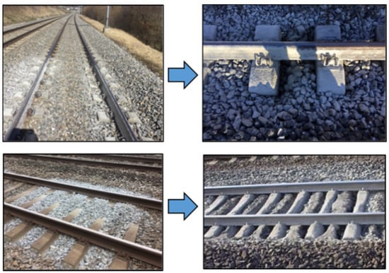 The ballasted track superstructure is the most-used superstructure worldwide due to its low construction costs, flexibility of application, automated maintenance, etc. However, it has significant disadvantages due to the relatively quick deterioration of its geometric quality. The ballast layer has the highest influence on track geometry quality, which causes high maintenance costs. The costs consist of track inspection and corrective maintenance costs that, despite the high automation, still reach up to 30% of the overall maintenance costs [1,2]. The first stage of the ballast layer inhomogeneous settlements is related to the sleeper void initiation due to track local instabilities. The void accumulation causes unfavorable dynamic interaction in the contact zone between the sleeper and ballast bed [3,4], which results in accelerated void accumulation. Thus, the void zone can itself quickly be the source of local instabilities and track-bed damage such as ballast pulverization and separate track irregularities. The late removal of local instabilities can cause in the late stage significant and costly damages of the track subgrade such as ballast pockets and ‘mud pumping’ places (Figure 1). Therefore, the recent sleeper void identification using monitoring means is the best way to reduce the maintenance costs.