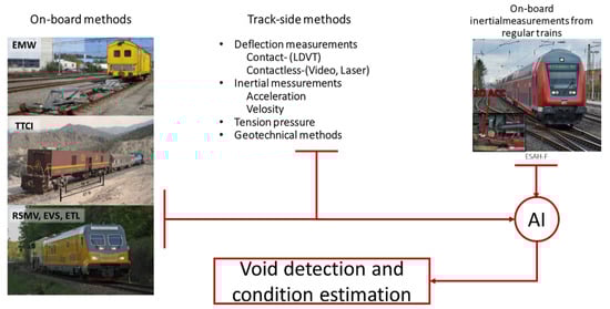 Nowadays, subgrade and sleeper support condition monitoring and estimation is presented by different on-board and track-side methods. The existing on-board monitoring methods (Figure 2, left) are usually referred to track stiffness measurement trains such as EMW-‘Einsenkungsmesswagen’ or the Swiss track stiffness measurement vehicle [5], RSMV or the rolling stiffness measurement vehicle of Swedish railway [6], TTCI or American track loading vehicle [7], CARS or Chinese track stiffness measurement system [6,7] and others. The on-board measurement of track stiffness is usually based on track deflection measurement under the different vertical loadings using special measurement trains. The methods provide an estimation of non-linear track-stiffness from which the void parameters can be detected and quantified. However, the on-board methods from measurement trains have many technical restrictions, such as the low train velocity and accuracy. Moreover, high measurement costs due to the necessity of the special measurement trains do not allow frequent enough measurements for tracking void development.