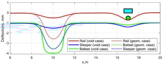 Experimental measurements [4] show that track dynamic behavior is characterized by complex dynamic interaction. The purpose of the modelling is to explore the features of the dynamic behavior of the railway track with sleeper voids and its difference to that caused by geometrical irregularity for the track-side and on-board measurements. Therefore, the track irregularities, which are applied in the model, are presented with void and geometrical irregularity. The void irregularities usually have the length up to 4 m and the depth up to 6 mm [4]. The depth and length values for the simulation case are m and mm. The form of the void irregularity is unknown. Most of the studies assume the rectangular form of the void, i.e., the constant over the length and step-like change to the state without the void. However, the experimental measurements show that there are some gradients over one to two sleepers of the void depth at both sides of the void irregularity. Therefore, it is assumed in the model that the void irregularity form is chosen as flattened sinus function with the void variation over two sleepers at both sides. Figure 4 depicts the deflections of three beams and the void irregularity as the gap between the second (sleepers) and the third (ballast) beam. The lines of the beams are shifted along the vertical axis to provide a better illustration of the irregularities and deflection.