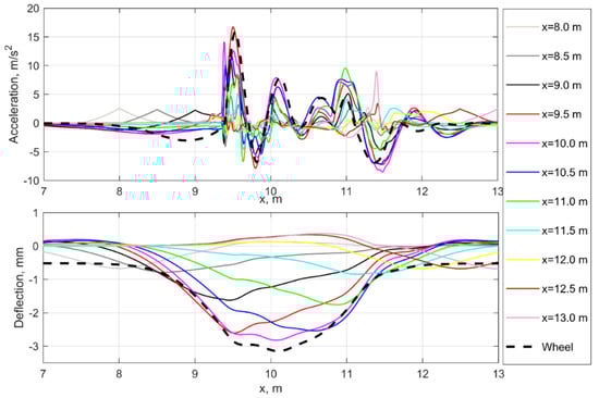 The simulation results are presented as the track deflection and accelerations corresponding to on-board and track-side measurements. Figure 5, top shows the simulated measurements of rail deflections and accelerations in the different track sections relative to the voided zone as well as the wheel accelerations and trajectory in the track axis coordinate system. The rail deflections (Figure 5, bottom) show the features of the experimental measurements [4]: one or two kinks or disturbances on the wheel trajectory before the peak of maximal deflection. The deflection disturbances position corresponds to the acceleration maximal peaks position in Figure 5, bottom. Such behavior is explained by the dynamic impact of sleepers in the moment of void closure, which occurs during wheel movement over the voided zone beginning. Thereby, an additional second impact can appear after the first one as well as the disturbance on the unloading line, depending on the void parameters and vehicle velocities. While the deflection processes differ noticeably depending on the measurement section position along the track, the acceleration processes more similar along the track. Similar impact interaction in the void zone of a rail joint is confirmed experimentally by the field studies [44,45] where the sleeper ballast loading was directly measured by loading cells.