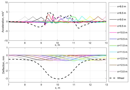 The simulation results for the equivalent to void geometric irregularity are presented in Figure 6. The main difference between dynamic interaction in the geometrical irregularity are the rail deflections (Figure 6, bottom) that are almost the same outside the irregularity while the wheel trajectory is similar to that of the void irregularity. The rail and wheel accelerations in Figure 6, top show more evident dynamic behavior; however, the maximal acceleration is more than three times lower than for the void irregularity. Additionally, there are no clear similarities between the wheel and rail acceleration processes. Thus, there are clear differences between the time-domain behavior in the void and the geometrical irregularity.