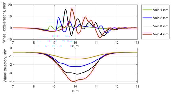 Simulated wheel accelerations and trajectories for the void irregularity.