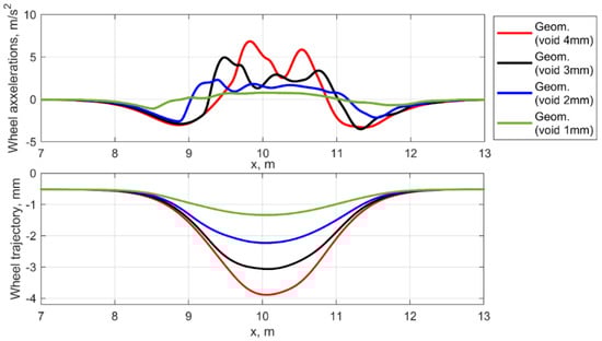 To provide a consistent analysis of the dynamic behavior, a comparison of the wheel trajectory and accelerations for different depths of void and the equivalent geometrical irregularities is presented in Figure 7 and Figure 8. The analysis shows the similar dynamic behavior in the voided zone Figure 7 for different void depths. The impact while entering the voided zone and the oscillations while leaving the zone are present for each void depth nut with different longitudinal positions.