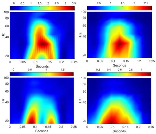 The Matlab wavelet scattering tools [63] were used to analyze the acceleration of the acceleration signals for the case of the void irregularity and that of the equivalent geometrical one. The tool uses a wavelet time scattering decomposition with two filter banks. The first filter bank has a quality factor of eight wavelets per octave. The second filter bank has a quality factor of one wavelet per octave. Figure 10 presents the results of wavelet scattering transform for two cases of irregularities 3 mm in form of the time-frequency presentation of first-order scalogram and scattering coefficients. There is an obvious difference between the wavelet power spectrum distribution of void (Figure 10, top, left) and geometrical irregularities (Figure 10, top, left). The geometric irregularities are presented with two different zones with power spectrum maximal values with frequencies under 27 Hz, while the maximal values for void irregularity are located between 25 and 60 Hz in one zone corresponding to the impact zone. The diagrams of the scattering coefficients differ from that of the scalogram. The scalogram coefficients extract the high frequency or detailed components, while the scattering coefficients extract the low frequency components at every level of resolution [63]. Therefore, the variation of the scattering coefficients is lower than for the scalogram. However, the spectrum maximal values have the same time-frequency location both for the scalogram and the spectrogram presentation.