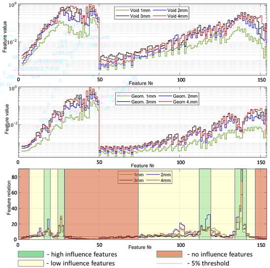The region of interest for the void detection are features 10 to 25 and 122 to 128, where the difference between the 2-, 3-, 4-mm lines are the lowest, which can be used as a common void indicator. Figure 11, bottom presents an estimation of the features corresponding to the highest difference between the void and geometrical irregularity zone as the relation between the features. The remarkable regions are for the feature numbers 1 to 10, 28 to 75 and 145 to 154, where the relation between them is less than 5% of the maximal variation, despite the maximal absolute values of the features. Thus, the features can be excluded from following statistical analysis. On the other side, there are the feature groups with maximal difference of void and geometrical zones for all considered depth cases from 1 to 4 mm: 16 to 20, 24 to 28, 112 to 119 and 134 to 140. The features can be used as void indicators. Indeed, the major number of features (65%) present high relative difference, but not for all depth cases and with high variation along the feature number. The features can be selected in the statistical processing using feature selection techniques.