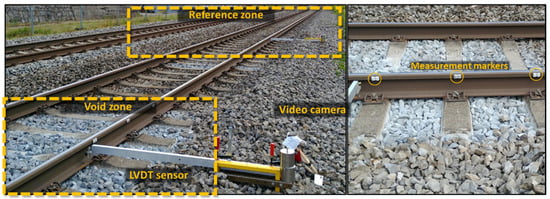 One of the most significant limitations of the reviewed studies is the low time-resolution of the used cameras that does not allow to acquire information about the dynamic impact of the sleepers on the ballast in the void zones. Additionally, most of the studies were used for a limited number of measurements due to the method complexity, which did not allow to collect the statistical information. The limitations are taken into account in the present study. The proposed method for the sleeper void identification is based on experimental information collected in track-side measurements of multipoint rail deflection. The high-speed video recording measurements were carried out in 15 different problem zones of Swiss railways (SBB) by infrastructure managers. The measurement evaluations were produced by ETH Zürich [79] and TU Dresden in the present work. The digital image correlation (DIC) method was used for extracting the rail deflection information. The results of the video measurement method were compared in three zones with the conventional measurement method by using the LVDT sensor that was placed on the console beam on the stable basis. The video recordings were carried out using two high-speed SONY DSC-RX0 cameras with an acquisition frequency of 1 kHz and an image resolution of 1920 × 1080 pixels. The recordings in each problem zone were realized using two high-speed cameras for the damaged zone and undamaged reference zone, 8 to 10 m away from the first one (Figure 12). The cameras were located on one side of the track, at 150 cm distance from the rail to have three markers in the field of view. This allowed a resolution of 0.61 mm/pixel.