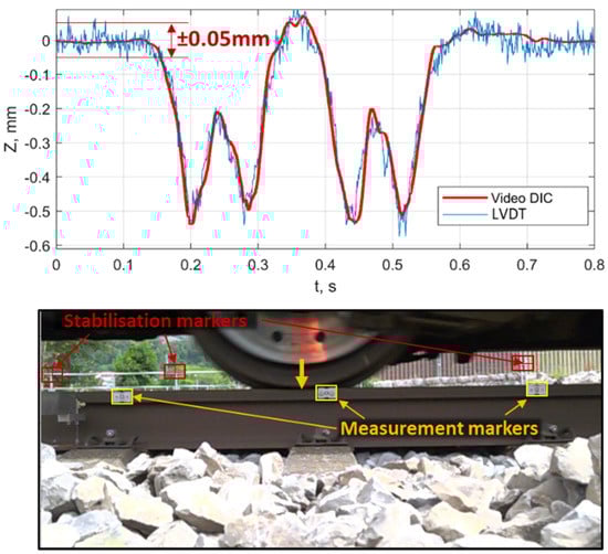 The measurement of rail deflection using high-speed video recordings is a cost-effective alternative to the LVDT (linear variable differential transformer) measurement, which enabled the collection of statistical information. The application of the DIC method increases the accuracy of marker tracking from 0.61 mm/pixels to about ±0.05 mm, which makes the accuracy of the video method sufficient for low rail-deflections in the reference zones (Figure 13, top). Additional advantages of the video measurements are multipoint tracking and the stabilization of train-induced camera vibration using the fixed background markers in the space between the wheelsets (Figure 13, bottom). Moreover, the simultaneous tracking of the wheel position offers additional advantages for void identification since the location of the rail deflection maxima does not correspond to the wheels position while running over the void zone. The software for rail DIC tracking and the automatic tracking of the background markers was developed.
