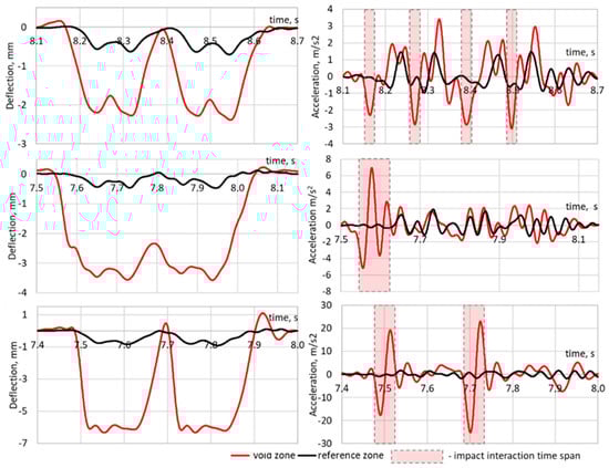 The typical measurement cases for different void damage from low to high are shown in Figure 14. First of all, the voided zones are characterized by an increase in deflections. Additionally, an increased dynamic interaction is present due to the impact of the sleepers on the ballast bed. The impact usually has the highest value before the wheel maximal deflections or in the time while the wheel enters the void zone. It is especially peculiar for a void depth more than 3 mm. The rail accelerations for a 6-mm void depth can reach or more than 10 higher times than for the reference track. The sleeper-ballast acceleration on the impact point could probably be higher than on the rail. The modelling results show that the sleeper acceleration during impact can reach 150 to 200, which could accelerate the ballast settlements and void development.