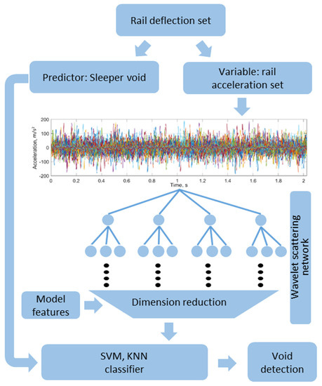 The present statistical investigation is based on experimental data collected from 15 damage zones using the developed high-speed photogrammetrical tool for rail deflection measurements. Thereby, the simulation results of the track–train dynamic interaction in voided and reference zones as well as their time-frequency analysis are used to improve the data-driven approach. The improvement consists of the additional model-based feature selection. The flowchart of the statistical processing is presented in Figure 15. The rail deflection dataset of 652 time series is separated in two independent variables: the vector of maximal sleeper void and the corresponding rail acceleration series dataset. Thereby, the Winkler-line rail deflections process is removed from rail deflections to avoid the bias to predictor variable. An additional reason for the high-pass filtering is the intention to investigate the vibration information that is the same both for the track-side and on-board measurements. Moreover, the study in the section modelling has shown the similar dynamic vibration due to dynamic impact in the void zone for both measurements.
