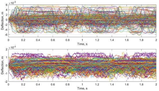 The rail deflection dataset consists of two groups: the first for the measurements in the various ballast damage zones and the second for the simultaneous measurement in the reference zone, 10 outside the void zone. Each measurement zone is equipped by three markers for rail deflection measurements. The measurements were carried out in each measurement zone for about 12 train passages of different train types with velocities in range the of 100 to 160 km/h. The overall dataset of successful measurements is 652 time series. The comparison of the time-series datasets for the void and reference zone is presented in Figure 16. The presented rail deflection lines are relative to the initial measurement point. The measured deflection range in the void zone (Figure 16, top) is up to five times higher than in the reference zone (Figure 16, bottom).