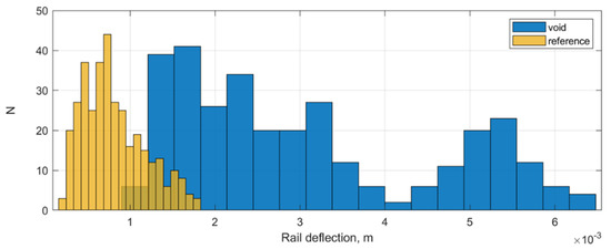 The histograms of maximal rail deflection distribution in the voided and reference zone are depicted in Figure 17. The diagrams show that the ballast damage zones are characterized by a wide maximal deflection distribution from about 1.5 mm up to 6 mm. The reference zones have the most measured deflections in a range up to 1 mm but some deflections can reach up to 2 mm. The reason is the influence of the damage-independent factors on the rail deflection such as various subgrade stiffnesses and various superstructure types.