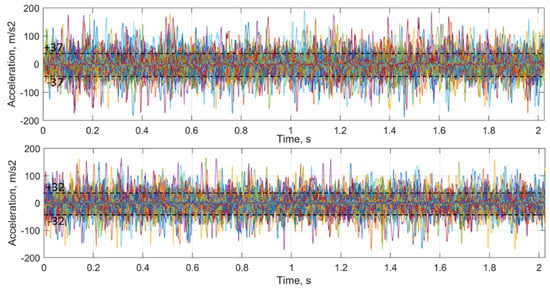 The acceleration datasets derived from deflections are presented in Figure 18 (top) for the void zone and in Figure 18 (bottom) for the reference zone. A low difference of rail accelerations for both cases with maximal values in the range of about is notable. However, the standard deviation of the 20 most significant peaks for the void zone is somewhat higher than for the reference one . The result is consistent with the experimental measurements of rail accelerations using acceleration sensors in the paper [4], where the maximal accelerations in the void zone were even lower than in the reference one. The lower measured acceleration range for the photogrammetrical measurement is explained with the measurement frequency of the videorecording compared to that of sensitivity range of the acceleration sensors.