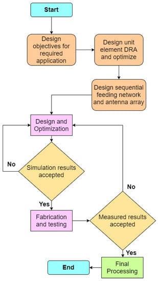 The design procedure of proposed DRA antenna array is shown in Figure 1, where each step is assigned for reaching the goals of the antenna specifications. It begins with the design of the objectives for the application of the proposed antenna. Here, we have the goal of designing a wideband antenna for the millimeter-wave application at 30 GHz with an axial ratio less than 3 dB and good gain.