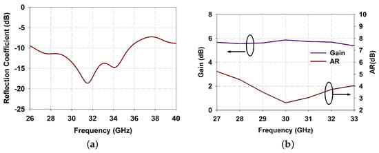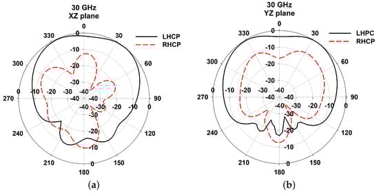 The EM analysis of the proposed flower-shaped DRA is performed using CST Microwave studio. In Figure 3a, it was observed that the refection coefficient of unit element DRA has a wide matching from 26.5 GHz to 35.5 GHz. Furthermore, a maximum gain of 5.88 dBi is obtained at the resonant frequency and 3 dB axial ratio bandwidth from 29.5 GHz to 31 GHz (Figure 3b). The radiation patterns shown in Figure 4 describe LHCP-RHCP patterns of the proposed slot-fed DRA unit element with broad beam and good cross-polarization.