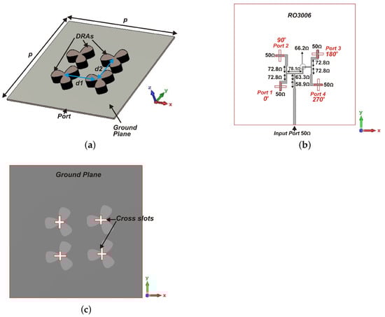 array of flower-shaped DRA are designed as shown in Figure 5a. The array elements are placed over the ground plane of 20 mm mm. The cross-slots and feeding network are etched on the top and bottom side of the laminate, respectively.