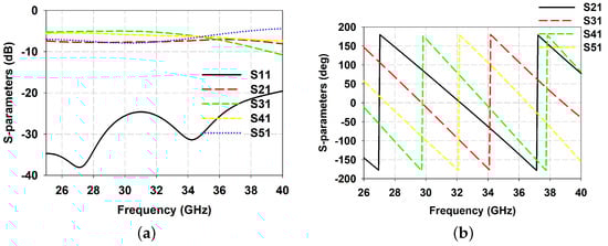 Simulated S-parameter values of feeding network (a) Amplitude; (b) Phase.