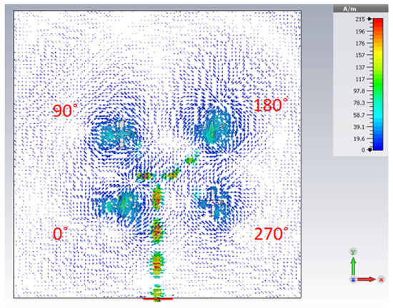 The parallel feeding network and the cross-slots etched provide a left hand polarized radiation in the far-field. Figure 8 provides an insight for the surface current distribution of the antenna at the resonant frequency. It is observed that the electric current pointers rotate in a clockwise pattern around each feed. Thus, the phase variation at each slot from 0°, 90°, 270° and 180° is obtained, which causes the generation of left hand circular polarized radiation.