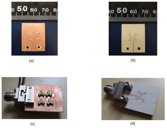 The fabricated prototype of the antenna is depicted in Figure 9. The top and bottom sides of the ground plane before installing the DRA are shown in Figure 9a,b. Southwest© 2.92 mm End launch connector is used for connecting the prototype to an RF source (Figure 9c,d).