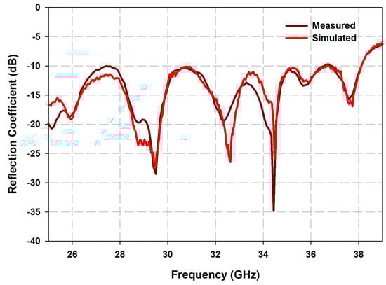 Comparison of simulated and measured reflection coefficient of the proposed antenna array.