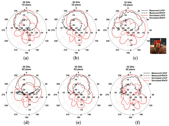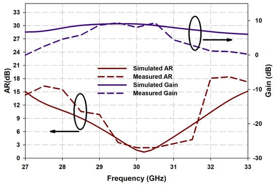 The measured results compared with the simulated results of reflection coefficients, radiation patterns, gain and axial ratio in the resonant bands are shown in Figure 10, Figure 11 and Figure 12, which are agreeable with the simulated ones. It is evident that the fabricated antenna can cover a wide impedance bandwidth from 27 GHz–38 GHz (Figure 10). The radiation patterns were measured in the far-field measurement facility (Figure 11) and compared with simulated ones depicted in Figure 12. The ripples in the pattern are due to the beam ellipticity. The good cross-polarization and side-lobe level are achieved similar with the simulated patterns in both planes. The maximum gain of 9.5 dBi is achieved as shown in Figure 13 and a 3-dB axial ratio in the band of 29.2 GHz–30.7 GHz is obtained. The discrepancies are due to the fabrication effects, such as the effect of glue and placement of DRA. Table 2 shows the comparison of previous works with the proposed antenna array. It is observed that the bandwidth is higher than the similar works reported previously.