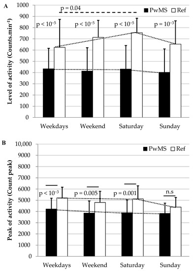 Considering the peak of activity (count max), significant differences with moderate to large effect sizes were found between groups for weekdays, the weekend and the Saturday (p = 0.005–0.001, d = 0.9–1.08) (Table 3 and Figure 1B). No significant difference was found for the Sunday. Values of peak of activity for the PwMS group corresponded to 76–87% of the values found for the Ref group.