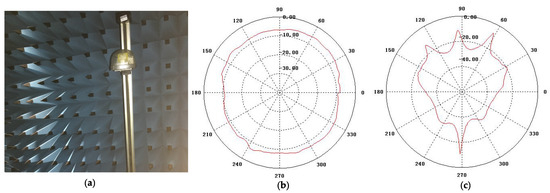 The time-division multiplexing channel sounder used in measurement campaigns was provided by the Norwegian University of Science and Technology (NTNU) and Selskapet for Industriellog Teknisk Forskning (SINTEF) [40]. Compared with other channel sounders, it has the advantages of being small, easy portability, and a stable signal that can be carried in vehicles. The sampling frequency of the channel sounder can reach 1 GHz/s, and the sounder works at a center frequency of 5.9 GHz with a bandwidth of 100 MHz. Thus, the channel sounder delay resolution Δ τ m i n = 10 ns can be derived. The power P T x of the transmitter (Tx) part is 16 dBm. We configured the Tx to transmit 1933 chirps in one second. The chirp signal with a period of T c h i r p = 517.24 s contains an interval of T g = 491.64 s and a signal length of T s c = 25.6 s. The structure of the transmitted signal can be found in Figure 1. The signal is emitted by an omnidirectional antenna (Figure 2). Before we conducted the measurement campaign, antennas with gains of 2 dBi were mounted on the apex of the vehicle roofs. The antenna pattern at 5.9 GHz is depicted in Figure 2b,c, in which we can observe that the antenna is omnidirectional in the horizontal plane (H-plane).