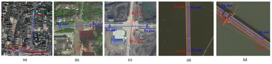 Figure 4. Satellite snapshot of the measured scenarios: (a) car-following scenarios in a dense urban area, (b) intersection in an urban area, (c) intersection in a rural environment, (d) suspension bridge, and (e) beam bridge.