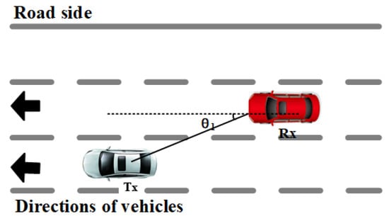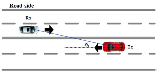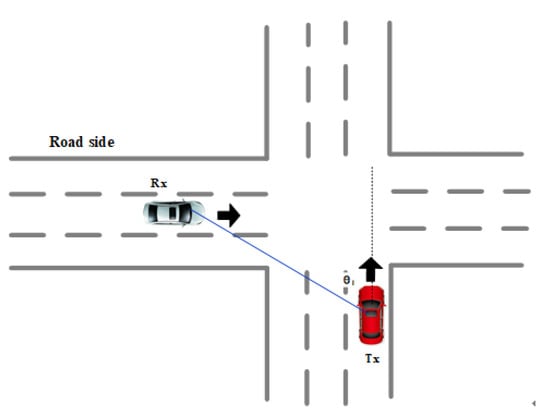 The two testing cars were moving like that shown in Figure 10. The relative speed under the intersection scenario is shown in Equation (7), where v t x is the speed of the Tx vehicle, v r x is the traveling speed of the Rx vehicle, and θ 1 is the angle between the LoS path of the two vehicles and the traveling direction of the Tx vehicle.
