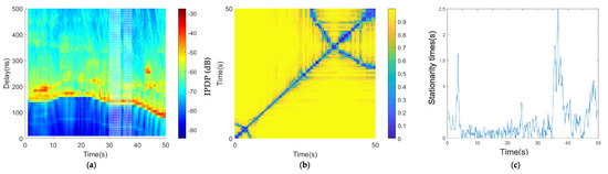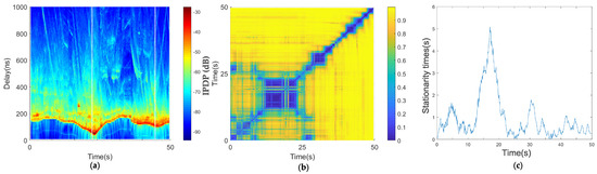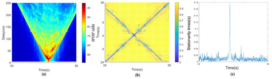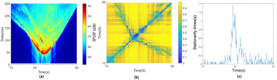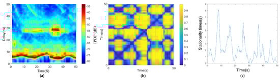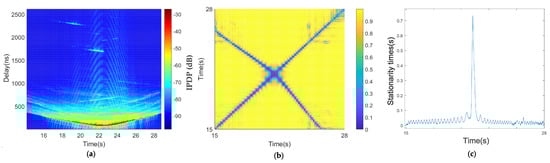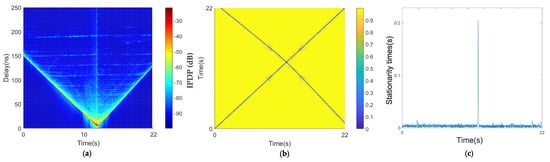 The time when the two vehicles were closest was 30 s; the distance between the two vehicles was about 15 m at this moment. Figure 11a shows that there were abundant scattering paths in the urban area, and there was a strong reflection path in the range of 25–30 s. The absolute delay of this reflection path relative to the main path was about 40 ns. The correlation matrix shows that the diagonal part is in the shape of a blue line, and there is an obvious box at about 30 s (Figure 11b); due to the minimum distance between the moving vehicle and the stationary vehicle, the angle reached 90 degrees and the relative speed reaches the minimum. Figure 11c shows that the maximum steady time at this moment was 1.4 s, whereas the steady time was short during the other moments because the two vehicles were continuously approaching or traveling away from each other; the stationary time was less than 0.1 s, and the maximum was only 0.2 s.
