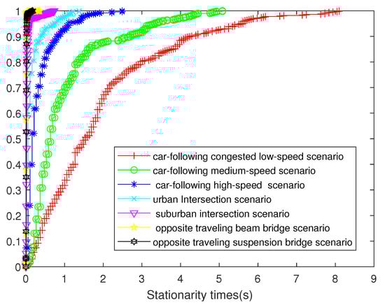 Based on the measured data in the previous sections, the stationarity time was derived by calculating the temporal PDP correlation coefficient. To better demonstrate the statistical characteristics of the results, the statistical results are elaborated in this section. Table 1 shows the maximum, mean, and standard deviation of the measured stationary times in seven scenarios, and Figure 16 shows the cumulative distribution function (CDF) of the stationary times of the seven scenarios. The most relevant factors affecting the measured stationary times’ size are the relative speed and absolute speed. Among them, the measured stationary times’ size was the largest in the same-direction driving scenario because the relative speed was the least. The absolute speed in these three scenarios was larger, and the measured stationary times were shorter. This conclusion is the same in paper [25], in which the measured average value of the window of stationary times in the same direction was 1.4 s, while the window of stationary times in the opposite direction was only 0.023 s, which is larger than the value in this paper because the average speed of 8.3 m/s in Scenario 3 is faster than in our measurement. For instance, traffic jams are common in China; the velocity in the congestion scenario ranged from 0.05 to 3.76 m/s. Notably, the relative speed in our measurements of the car-following congestion scenario was quite slow, because the two test cars were stuck in a traffic jam during the campaign. Thus, the mean value of the stationary time of 1.9419 s is much longer than that in [25]. Additionally, the length of the measurement in [25] was only two seconds, and the relative speed change in the same direction was very small. We used a longer measurement period, so the result is more informative.