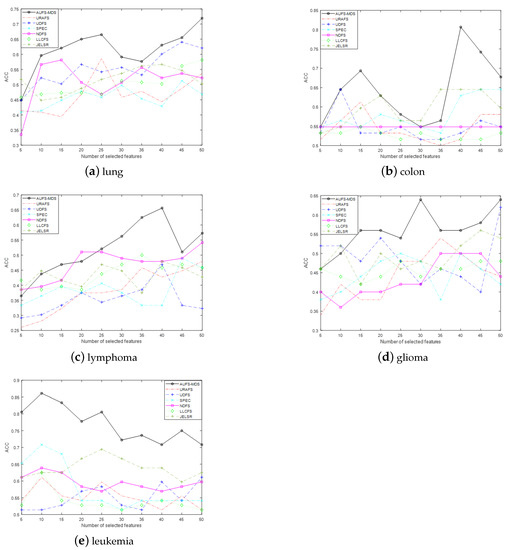 From Figure 2a–d, ACC indicators of other types of cancer except leukemia show an overall increasing trend in the initial stage of gene selection, while this begins to decline as the number of selected genes further increases. In addition, MDS-AUFS always achieves the maximum clustering ACC with fewer genes. It is may be inferred that all algorithms may achieve good performance when more keys gene are selected, and the proposed algorithm shows the best performance of all of the approaches; moreover, once all keys gene have been selected, irrelevant or redundant genes can be introduced into the algorithm as the number of selected genes further increases, leading to the performance of algorithms declining. From Figure 2e, we can see that the ACC of almost all algorithms show a decreasing trend, which implies that there is a small number of key genes related to leukemia. Furthermore, the maximum number of selected genes with respect to ACC in all methods is different in different gene datasets. For example, the number of selected genes is 40 when MDS-AUFS achieves optimal performance on colon data, while it is 10 for leukemia data. We have reason to believe that the number of key genes in different types of cancer is also different. Obviously, accurately selecting the key genes or gene subsets that contain the most key genes is important in cancer classification.