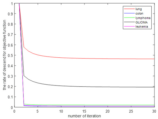 In this section, some experiments are presented that show the convergence of the iterative process of the MDS-AUFS algorithm. To intuitively observe the overall convergence of the MDS-AUFS algorithm, we normalized the value of the objective function after each iteration. As shown Figure 4 MDS-AUFS shows good convergence and quickly converged in all gene datasets, and it could achieve convergence in general in about 10 iterations.