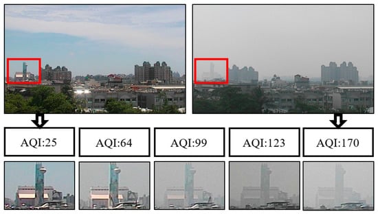 PM2.5 and PM10 are prominent among the factors affecting air quality. Previous studies have pointed out that PM2.5 [], PM10 [], and relative humidity (RH) [] have a serious impact on visibility [,]. It is not difficult to see that visibility has a positive relationship with AQI. Visibility is measured by trained professionals in the traditional way []. In recent years, various techniques for estimating visibility via images were developed [,]. The features, such as transmittance [], entropy [], contrast [], and high-frequency information [], are extracted from images and used to estimate visibility. The image characteristics of the scene, such as sky color, contrast, and spectral slope, are also used to estimate AQI [,]. In addition to image features, weather factors (such as RH, wind speed, or temperature) are used to adjust the parameters. In order to classify AQI into six categories, the multi-core learning method was applied. The results show that the average classification accuracy rate was 84%.
