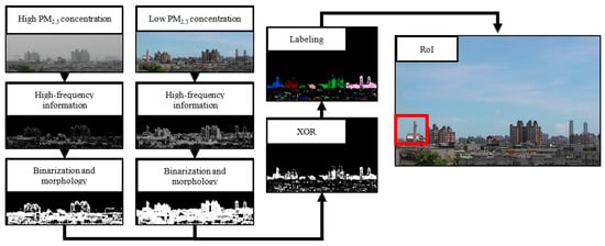 A flow chart of the automatic selection of RoI is shown in Figure 2 []. To find the difference between high and low visibility images, two images with different PM2.5 concentrations (high and low) were treated as a group. Each image of a group had high-frequency information extracted individually. High-visibility images would have more high-frequency information than low-visibility images. The binarization method and morphology were applied to obtain pixels with large differences in high-frequency information within individual images. The XOR operation leaves pixels of two images with large high-frequency differences. The pixels with large differences were combined with neighbors into a region via labeling. The labeling process was conducted by an algorithm that gave connected pixels the same label. Pixels with the same label could be treated as the same region. In regions obtained by calculating every group, the region with the largest high-frequency information is the RoI.