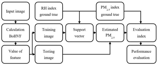 Figure 3 is a flowchart of the proposed AQI estimation method. First, the RoI is selected after the images are inputted. Features are extracted from images in the RoI and calculate feature values, and then divide these values into training data and test data. The characteristic value, actual AQI value, and actual RH value in the test data are input to Support vector regression (SVR) [] for training. The image of the test data is estimated through the trained SVR to estimate the AQI value. Afterward, the estimated AQI and the actual AQI will be evaluated through evaluation indicators. Finally, the estimated performance is obtained. In Section 3.1, the dataset used for the experiment is introduced. Since the RoI selected method was proposed by Liaw et al., the method of the RoI selection process will not be introduced here. The method used to calculate the feature values will be introduced in Section 3.2. Section 3.3 will introduce the training data and test data of the image. Section 3.4 will introduce the support vector regression. Section 3.5 will introduce the evaluation index for evaluating the performance of the proposed method.