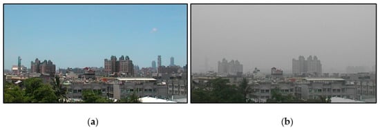 Since distance is the main factor affecting visibility, the measurement of visibility with buildings at different distances has also become a research topic. Buildings with different distances or different features in the image can be divided into different regions. The region used to estimate the visibility or air pollution index are selected as regions of interest (RoI) [,]. The features (the distance, fog model, entropy, contrast, sky color, sky gradient, and sunlight incidence angle) in the RoI are compared with the air pollution index, and the coefficient of determination (R2) is obtained with acceptable results. Moreover, the pixel values are shown as having an exponential relationship with the different distance objects []. The RoI has achieved good results with respect to estimating air pollution with image processing technologies. However, too many features and manually selected RoI are disadvantages of the operation.