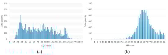 The distribution of AQI and RH values at Renwu Monitoring Station in Kaohsiung, Taiwan; (a) AQI value distribution and (b) RH value distribution.