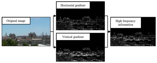 Figure 6 shows the horizontal and vertical gradient calculation of the image and the combination of the two images used to calculate the high-frequency information. Lx in formula (7) calculates the horizontal weight, Ly calculates the vertical weight, and then Lx,y is calculated by formula (8) to calculate the high-frequency information.