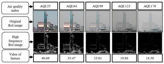 where Gi is the pixel position (x,y) in the high-frequency information, the value of the feature is the average value of Gi (x,y) in RoI, where the RoI is M × N. (px, py) is the coordinate position of the upper left corner of the RoI. Figure 8 shows the images presented at different AQI values, as well as the corresponding high-frequency images and feature values. When the AQI value increases, the image in the RoI gradually loses its outline and detailed texture. In the calculated high-frequency image, the high-frequency information of the building is also reduced. The calculated characteristic value also drops accordingly. Therefore, the value of AQI is negatively correlated with the calculated characteristic value of the high-frequency information.
