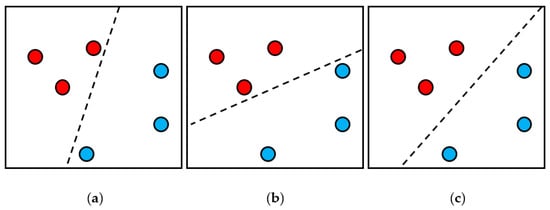With the development of computer technology, there have been many technological breakthroughs in regression models []. Regression models are also used in the field of machine learning. The SVR application was used in this study. SVR is an application method used by the Support Vector Machine (SVM) [] to solve regression estimation problems. The concept of SVM is shown in Figure 9. On two-dimensional data, the red and blue data are needed to divide, so they can be divided with a one-dimensional line. Obviously, Figure 9c has the best segmentation result because the segmentation line has the farthest distance from the data point. However, usually, the data is not only two-dimensional, so the data is needed to be mapped to a higher dimension to divide the data. Two-dimensional data can be divided by one-dimensional lines, and after the data is mapped to a three-dimensional space, the data can be divided by a two-dimensional plane. Therefore, when the data is mapped to an n-dimensional hyperplane, the data can be divided by an (n-1)-dimensional hyperplane.