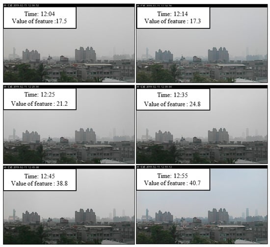 In the collected image database, images were taken every 10 min, but the AQI value was one image per hour. This resulted in a situation where there is only one AQI value but six images in an hour. This is because when the air quality monitoring station measures the AQI value, it takes about 1 hour of sampling time. However, in actual situations, the feature values calculated from the six images within this hour are likely to show large changes. This is because air pollutants are usually not uniform in the air, and visibility levels within an hour may vary greatly due to wind speeds, weather conditions, and relative humidity of the day. Therefore, when the variation of the characteristic value within one hour is too large, the estimated AQI will also have big differences. However, the AQI corresponding to these six sheets has only one value. The performance evaluated at this time would be affected. As shown in Figure 11, the AQI in this hour had only one value, but the characteristic value of the six images changed from 17.5 to 40.7. At this time, the estimated AQI value would also show a very large change. Therefore, we excluded data whose characteristic values changed too much.