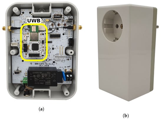 In the proposed solution, UWB radio mounted in the EGW device acts as a master device. It coordinates the communication activities by sending beacons containing requests for slave devices. UWB radios in standalone devices acting as slave devices predominantly listen for beacons received from the master device and respond accordingly []. A typical pilot deployment in SAAM consists of two standalone UWB devices and one EGW device. Standalone UWB devices are provided in a socket-on-socket enclosure for easy installation and minimal interference to the existing living environment. This approach ensures unrestricted use of existing sockets while covering the environment at the adequate height from the floor. Examples of an EGW device with mounted UWB card and a standalone socket-on-socket UWB device are presented in Figure 1.