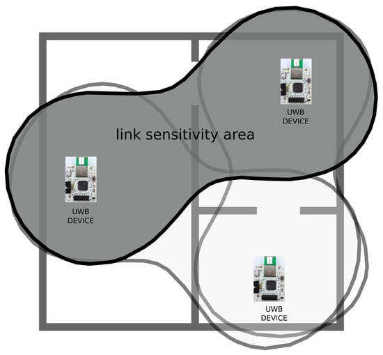 In order to maximize the motion detection area in the apartment, the radio links have to be organized in a way to maximize the area covered by the links. The main condition for a moving target to be detectable by a TX-RX pair is that it must be inside a maximum Cassini oval whose size depends on the antenna gains, transmitted power, wavelengths, and receiver’s signal-to-noise ratio (SNR) []. For instance, in the SAAM project with three UWB devices per pilot site, the maximum coverage is obtained when the deployed UWB devices resemble triangular shape, as shown in Figure 2. The size of the apartment that can be covered by three UWB transceivers, or the distance in indoor environment that can be covered by one pair of UWB devices, strongly depends on the actual environment layout, the number and type of walls between the devices, and the furniture layout. Exact locations of devices may be further conditioned by the positions or availability of power sockets, so in most cases, the resulting links between devices are characterized as NLoS. Nonetheless, in our testing deployments, we successfully established a link across more than 12 m with four intermediate internal plaster walls, whereas in outdoor LoS conditions, according to the device specification, a communication can be established between a pair of UWB devices operating at maximum permitted output power at a distance of up to 290 m at 10% packet error ratio (PER) [].